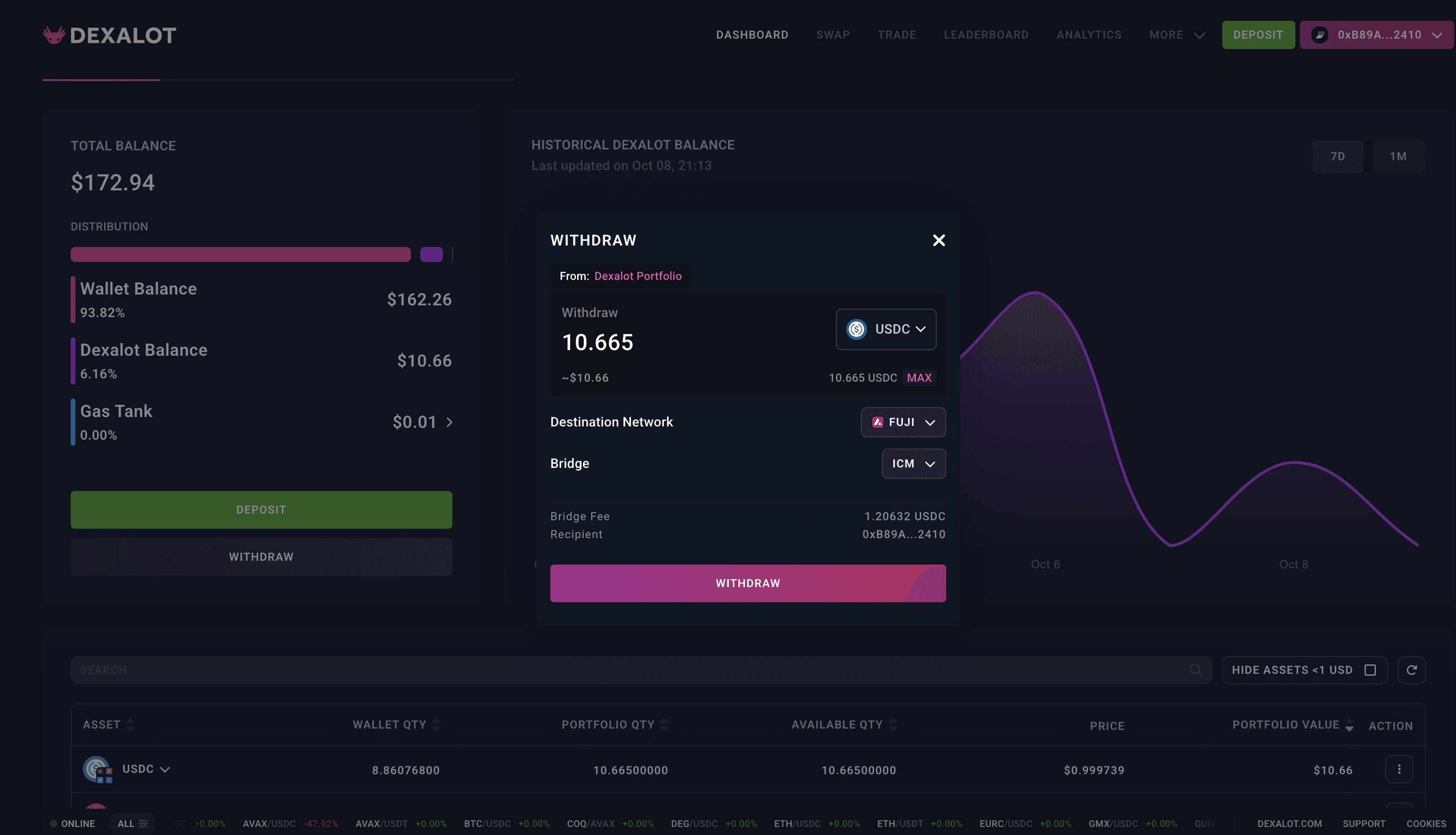 From the Dashboard tab, withdraw your AVAX and USDC back to the Fuji C-Chain by clicking on the "Withdraw" gray button on the left: