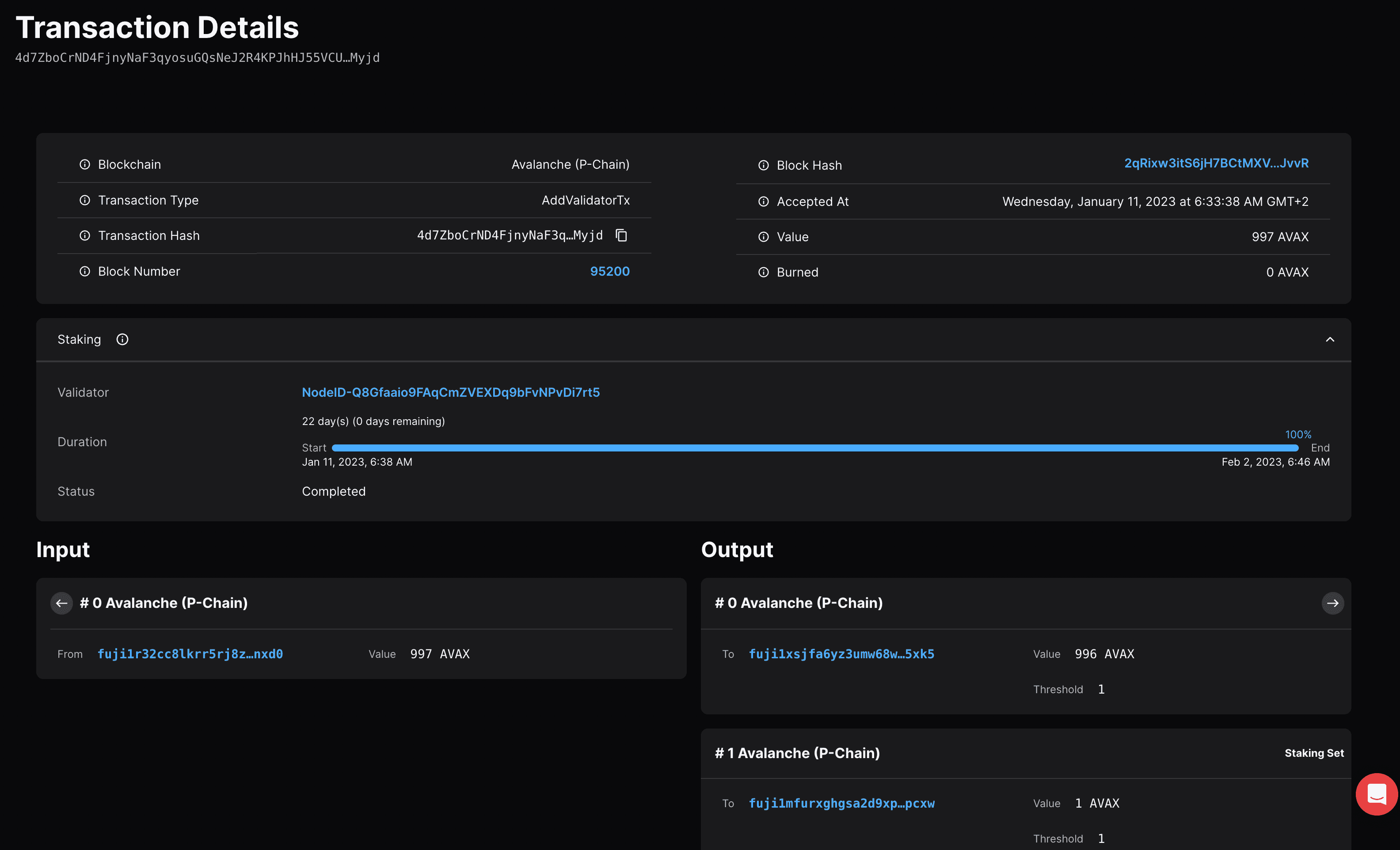 If you click on View on explorer, a new browser tab will open with the details of the AddValidatorTx. It will show details such as the total value of AVAX transferred, any AVAX which were burned, the blockchainID, the blockID, the NodeID of the validator, and the total time which has elapsed from the entire Validation period.